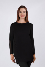 Туника женская из трикотажного полотна и сетки. Рукав со спущенной проймой с декоративной вставкой из сетки. Перед с рельефами и нагрудными вытачками. Низ переда короче по отношению к низу спинке.