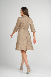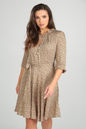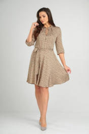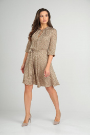 Платье выполнено из штапельной ткани, без подкладки с плечевыми накладками, по линии талии отрезное, в боковом шве молния, по горловине рюша и завязки.