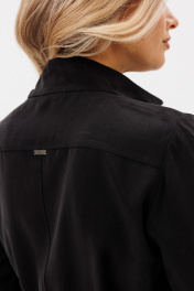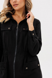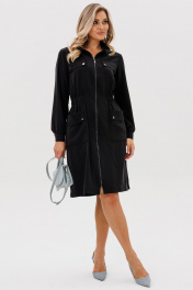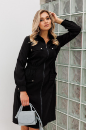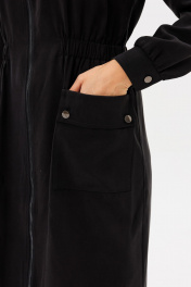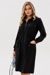 Платье женское, прямого кроя. Горловина со стойкой. Рукав длинный втачной, с манжетой на пуговице.По переду обработана планка с молнией. А также карманы клапаны. В области талии обработана кулиса с резинкой на сборку. Спинка со средним швом и кокеткой.