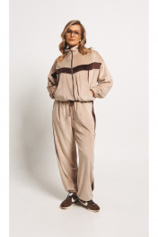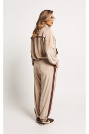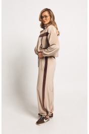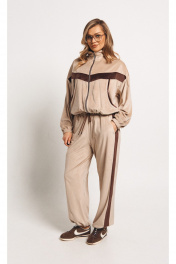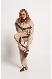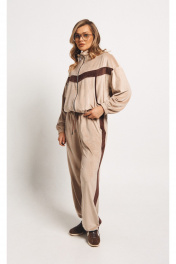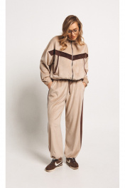 Костюм спортивный женский состоит из джемпера и брюк. Костюм выполнен из велюровой ткани. Джемпер кроя “oversize” с воротником-стойкой и застежкой на молнию. Рукав спущенный, двухшовный. По низу рукава резинка. По переду отрезная фигурная кокетка, в рельефе карман. По низу джемпера есть кулиса с регулировкой. Брюки прямые на поясе с резинкой, крой “oversize”. Есть карманы в боковых швах. Ширина брюк по низу регулируется кулисой.