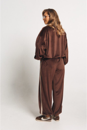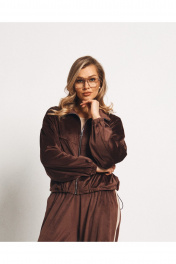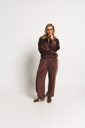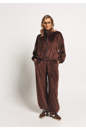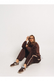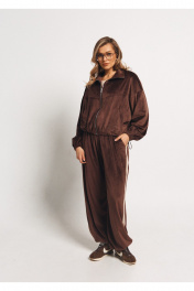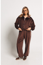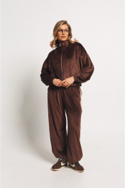 Костюм спортивный женский состоит из джемпера и брюк. Костюм выполнен из велюровой ткани. Джемпер кроя “oversize” с воротником-стойкой и застежкой на молнию. Рукав спущенный, двухшовный. По низу рукава резинка. По переду отрезная фигурная кокетка, в рельефе карман. По низу джемпера есть кулиса с регулировкой. Брюки прямые на поясе с резинкой, крой “oversize”. Есть карманы в боковых швах. Ширина брюк по низу регулируется кулисой.