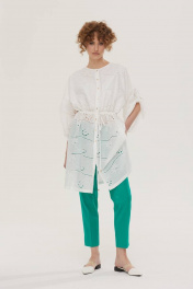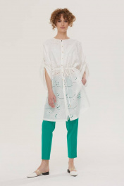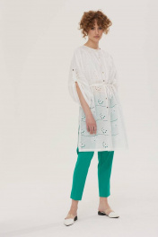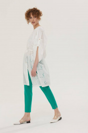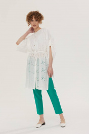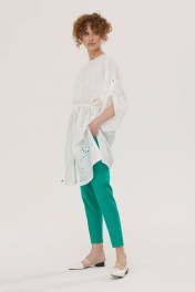 Комплект брючный. Блузка удлиненная из хлопковой ткани «шитье». Застежка по переду на петли и пуговицы. Вырез горловины круглой формы. Рукава свободные с регулировкой длины на пату. По талии блузка регулируется кулисой с завязкой. В боковых швах разрезы. Верхняя часть переда на хлопковой подкладке. Брюки, зауженные к низу. Верх на поясе со шлевками, в боковых частях пояса вставлена резинка. Спереди застежка на молнию. В боковых швах карманы. Сзади имитация прорезных карманов. По низу боковых швов небольшие разрезы. 44 р-р: блузка: ОГ - 142 см., ОТ - 138 см., ОБ - 140 см.; брюки: ОТ - 72 см., ОБ - 94 см. 46 р-р: блузка: ОГ - 146 см., ОТ - 142 см., ОБ - 144 см.; брюки: ОТ - 76 см., ОБ - 98 см. 48 р-р: блузка: ОГ - 150 см., ОТ - 146 см., ОБ - 148 см.; брюки: ОТ - 80 см., ОБ - 102 см. 50 р-р: блузка: ОГ - 154 см., ОТ - 150 см., ОБ - 152 см.; брюки: ОТ - 84 см., ОБ - 106 см. 52 р-р: блузка: ОГ - 158 см., ОТ - 154 см., ОБ - 156 см.; брюки: ОТ - 88 см., ОБ - 110 см. Длина рукава от горловины 65 см