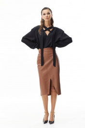 Юбка-карандаш из «эко» кожи. Верх на притачном поясе высотой 4см. Застежка по спинке на потайную молнию. Перед с кокеткой и разрезом фигурной формы. Юбка на подкладке.