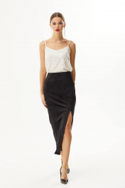 Юбка –карандаш выполнена из трикотажного велюра. Длина миди с эффектным разрезом по переду. Сзади застежка – молния. На подкладке.