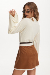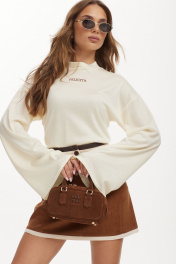 Джемпер из трикотажного полотна. Линия плеча спущена. Воротник-стойка. Рукав длинный, расширен книзу. На переде печать.