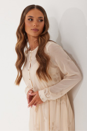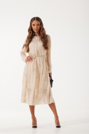 Платье из шифоновой ткани. Длина миди. Платье отрезное по талии. Талия собрана на резинку. Горловина круглой формы. Застежка по переду на петли и пуговицы. Застежка до талии. Рукав прямой с манжетой понизу. Манжета с застежкой на петлю и пуговицу. В комплекте декоративный завязывающийся пояс. В качестве подкладки используется нижнее платье на регулируемых бретелях. Силуэт прямой. Длина мини. Длина рукава 61 см. ширина плеча - 11 см. Длина платья верхнее платье - 116 см. длина спинки до талии - 40 см. нижнее платье - 90 см. Измерения по готовому изделию 44 р-р: верхнее платье: ОГ - 94 см., ОТ - 88 см., ОБ - 128 см.; нижнее платье: ОГ - 88 см., ОТ - 88 см., ОБ - 102 см. 46 р-р: верхнее платье: ОГ - 98 см., ОТ - 92 см., ОБ - 132 см.; нижнее платье: ОГ - 92 см., ОТ - 92 см., ОБ - 106 см. 48 р-р: верхнее платье: ОГ - 102 см., ОТ - 96 см., ОБ - 136 см.; нижнее платье: ОГ - 96 см., ОТ - 96 см., ОБ - 110 см. 50 р-р: верхнее платье: ОГ - 106 см., ОТ - 100 см., ОБ - 140 см.; нижнее платье: ОГ - 100 см., ОТ - 100 см., ОБ - 114 см. 52 р-р: верхнее платье: ОГ - 110 см., ОТ - 104 см., ОБ - 144 см.; нижнее платье: ОГ - 104 см., ОТ - 104 см., ОБ - 118 см.