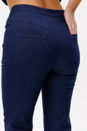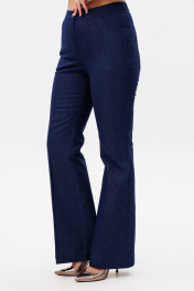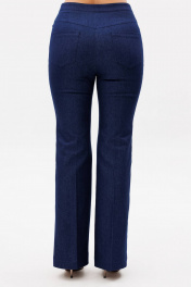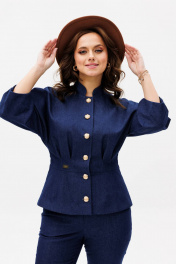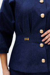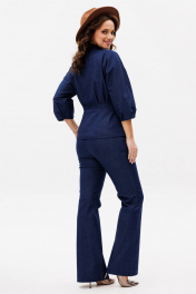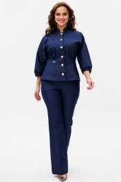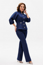 Костюм женский, состоит из жакета и брюк. Жакет приталенного силуэта на подкладке из 100% хлопка. Перед с центральной бортовой застежкой на петли-пуговицы. Перед и спинка отрезные по линии талии со встречными складками выходящими из подреза. На басках обработаны талиевые вытачки. Рукав цельнокроеный типа "летучая мышь" длиной 3/4 с односторонними кладками. Воротник стойка. Брюки клёш от колена с центральной застёжкой на молнию и петлю-пуговицу. По передним и задним половинкам заутюжены канты. В боковых швах карманы. Задние половинки с отрезными кокетками и накладными карманами. Пояс притачной.