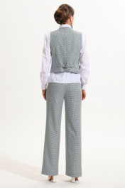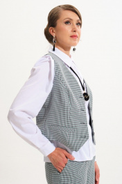 Комплект женский, состоит из жилета и брюк. Жилет прилегающего силуэта на подкладке.Центральная бортовая застёжка на петли пуговицы.Вырез горловины V-образной формы.На полочках прорезные карманы с листочкой - втачными концами. На спинке выполнен хлястик с пряжкой, для регулировки прилегания по линии талии.Брюки прямого силуэта.В боковых швах выполнены карманы.Пояс притачной плосколежащий.На поясе выполнены шлевки, для поддержания навесного пояса.