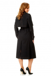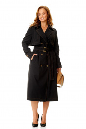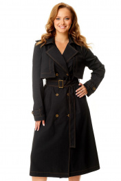 Тренч свободного покроя. Спинка со средним швом и высокой шлицей. По переду выполнены прорезные карманы с листочкой. Центральная двубортная застёжка на петли-пуговицы. На спинке и переде выполнены отлетные кокетки с отделочными строчками контрастного цвета. Для поддержания навесного пояса настрочены декоративные шлевки. Воротник отложной пиджачного типа с отрезной стойкой. Рукав втачной двухшовный с хлястиками и шлевками по низу рукава. На плечах выполнены паты со шлевками. имеется навесной пояс с декоративной пряжкой.