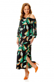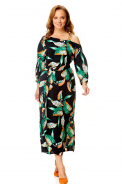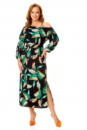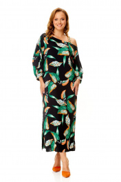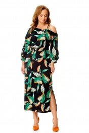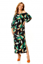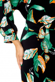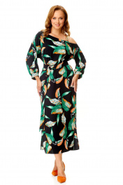 Классическое платье с ассиметричной горловиной и поясом VI ORO VR-1141 черный+листья