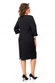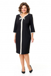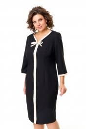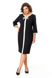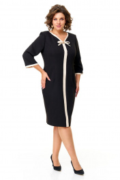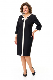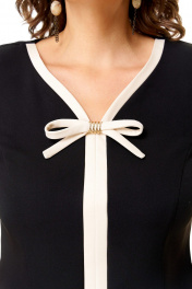 Платье женское полуприлегающего силуэта с естественной линией плеча. Рукав 3/4 втачной одношовный с контрастным кантом по низу. Горловина оригинальной авторской формы с контрастным кантом переходящим в планку по переду. По переду выполнены полурельефы выходящие из пройм. Спинка с вытачками. В среднем шве спинки застежка на потайную тесьму-молнию и шлица. На мысик горловины пришита золотистая протяжка, в которую вставлен бантик контрастного цвета.