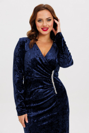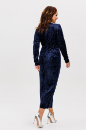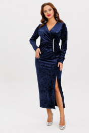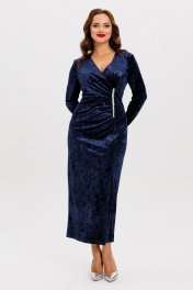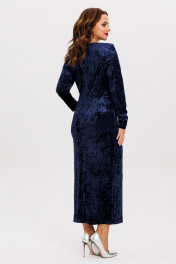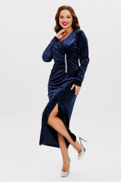 Платье женское полуприлегающего силуэта, заужено к низу. Рукав длинный, втачной, одношовный. По переду горловина V-образной формы. Перед ассиметричный. Слева выполнен рельеф, заканчивающийся высоким разрезом. В рельеф вставлена правая часть переда с легкими складками и нашита декоративная метализированная декоративная тесьма со стразами. Спинка со средним швом, талиевыми вытачками и застежкой на тесьму-молнию. Горловина обработана бейкой из подкладочной ткани 100% хлопка.