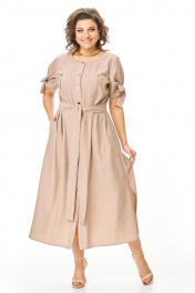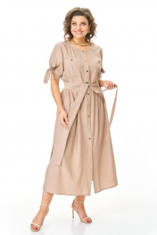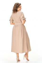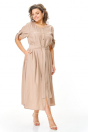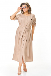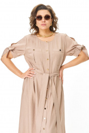 Платье женское свободного покроя с легким расклешением к низу и естественной линией плеча.Рукав втачной с разрезом в верхнем шве и манжетой переходящей в завязки.Горловина округлой формы.Перед с отрезной планкой, застежкой на петли-пуговицы, вытачками переходящими в складку и нагрудными карманами.Спинка с подрезом ниже линии талии, сборкой в нижней части и втачным поясом переходящим в завязки.В боковых швах обработаны карманы.