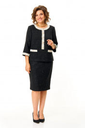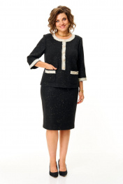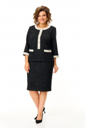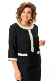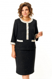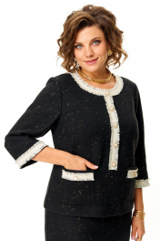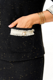 Платье прямого силуэта с естественной линией плеча на трикотажной подкладке.Платье выполнено имитацией жакета и юбки карандаш.Спинка со средним швом и застежкой на молнию. Перед с нагрудными вытачками и накладными карманами.Вырез горловины округлой формы.По горловине и переду настрочены отделочные бейки с необработанным краемРукав втачной одношовный длиной 3/4.По низу рукава настрочена отделочная бейка с необработанным краем.На изделие пришиты декоративные пуговицы.Ткань с добавлением шерсти, ворсистой фактуры с вплетением металлизированной нити.