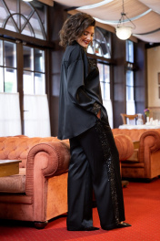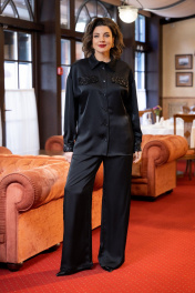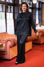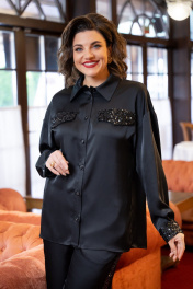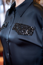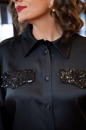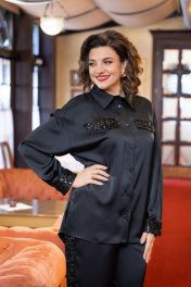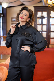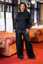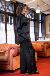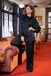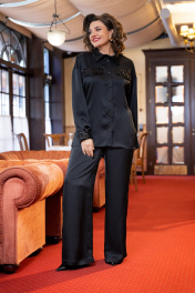 Костюм женский состоит из блузы и брюк.Блуза свободного покроя со спущенной линией плеча.Центральная бортовая застёжка с планкой на петли-пуговицы Рукав втачной одношовный. Низ рукава с манжетой из полотна с пайетками и складками.Спинка с кокеткой и встречной складкой.Воротник на отрезной стойке блузочного типа.По переду настрочены декоративные клапаны из полотна с пайетками.Брюки свободные расширенного силуэта.По бокам выполнены лампасы из полотна с пайетками.Пояс притачной на резинке.В боковых швах карманы.