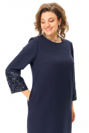 Платье прямого силуэта с естественной линией плеча.Спинка со средним швом и застежкой на молнию.В среднем шве спинки выполнена шлица.Перед с нагрудными вытачками.Вырез горловины округлой формы.Рукав втачной одношовный длиной 5/8.Низ рукава обработан манжетой и ткани с пайетками.В боковых швах обработаны карманы.