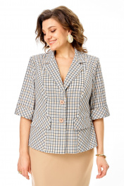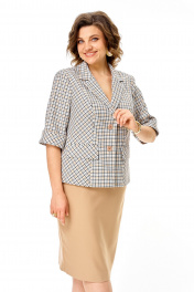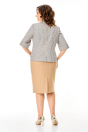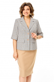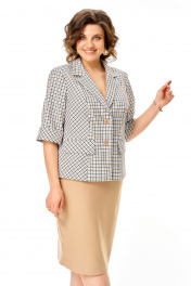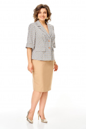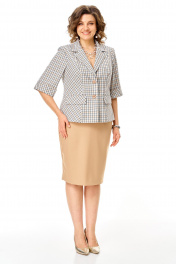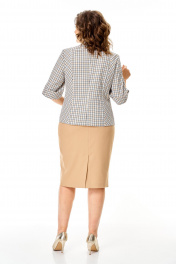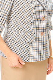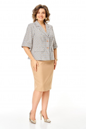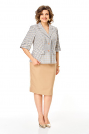 Костюм женский состоит из жакета и юбки. Жакет полуприлегающего силуэта с естественной линией плеча на подкладке.Спинка со средним швом и рельефами из плеча.Перед с рельефами из плеча, прорезными карманами "в рамку" и клапанами.Застежка центрально-бортовая на две петли-пуговицы.Воротник отложной пиджачного типа.Рукав коротки до линии локтя с отложной манжетой.Юбка на подкладке зауженного силуэта типа "карандаш".В среднем шве заднего полотнища застежка на потайную тесьму-молнию и шлица.Пояс притачной с резинкой в боковых швах.