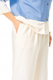 Костюм женский состоит из жакета и брюк. Жакет прямого свободного покроя со спущенной линией плеча.По переду обработана настрочная планка.Застежка центральная бортовая на золотые кнопки.По спинке и переду обработана отрезная баска контрастного цвета.Воротник блузочный отложной.Рукав длинной 3/4.По низу рукава обработана отрезная манжета контрастного цвета.По переду имеются накладные карманы с бантовыми складками и клапанами.Брюки свободные прямого силуэта.На передних половинках выполнены по две односторонние складки.Пояс притачной на резинке с втянутым шнуром.В боковых швах карманы.Вся фурнитура металлическая premium качества.