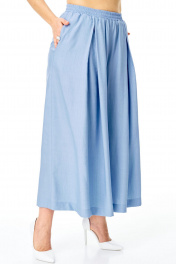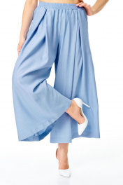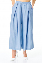 Костюм женский состоит из блузы и юбки-брюки. Блуза прямого свободного покроя.Рукав короткий типа "летучая мышь" с отложной манжетой.По переду пробиты увеличенные люверсы.По переду и спинке обработана кулиса с втянутым поясом.Горловина округлой формы, окантована.В боковых швах обработаны разрезы.По переду, снизу, пришита декоративная нашивка авторской формы.Юка-брюки свободные, расширенного силуэта.Пояс притачной на резинке.В боковых швах карманы.На передних половинках обработаны глубокие встречные складки.В комплект входит навесной пояс.Вся фурнитура металлическая premium качества.