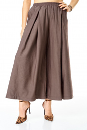 Костюм женский состоит из блузы и юбки-брюки. Блуза прямого свободного покроя.Рукав короткий типа "летучая мышь" с отложной манжетой.По переду пробиты увеличенные люверсы.По переду и спинке обработана кулиса с втянутым поясом.Горловина округлой формы, окантована.В боковых швах обработаны разрезы.По переду, снизу, пришита декоративная нашивка авторской формы.Юка-брюки свободные, расширенного силуэта.Пояс притачной на резинке.В боковых швах карманы.На передних половинках обработаны глубокие встречные складки.В комплект входит навесной пояс.Вся фурнитура металлическая premium качества.