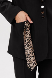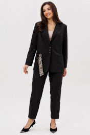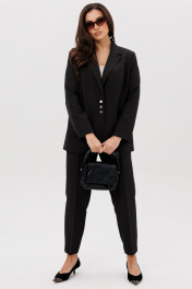 Костюм женский двухпредметный, состоящий из жакета и брюк. Жакет удлиненный полуприлегающего силуэта с центральной бортовой застежкой до линии перегиба лацкана на 4 петли-пуговицы. Перед с фигурным бочком, в котором обработан карман, и талиевой вытачкой. В правом кармане пришит декоративный элемент, на который завязывается съемный бант из подкладочной ткани. Спинка со средним швом. Рукава втачные двухшовные длинные. Воротник пиджачного типа. Брюки, зауженные к низу, с притачным поясом, сзади на резинке. Застежка на тесьму-молнию в средних срезах передних половинок и одну петлю-пуговицу по поясу. На брюках заутюжены стрелки. На задних половинках по низу заложена односторонняя складка с петлей и пуговицей.