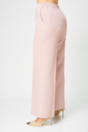 Костюм женский двухпредметный, состоящий из жакета и брюк. Жакет полуприлегающего силуэта, удлиненный, с центральной бортовой застежкой на 2 петли-пуговицы до линии перегиба лацкана. Перед с нагрудными вытачками, выходящими из горловины. Боковые швы с разрезами, между которыми по спинке вставлен пояс фигурной формы с декоратичной нашивкой. Спинка со средним швом. Воротник пиджачного типа. Рукава втачные двухшовные длиной 3/4. Брюки палаццо с притачным широким поясом на резинке от заутюженных стрелок по передней половинке вкруговую. Застежка на тесьму-молнию в средних срезах передних половинок брюк и 2 петли-пуговицы по поясу.