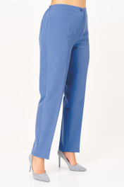 Комплект женский, состоящий из туники и брюк. Туника А-образного силуэта с центральной застежкой на планку до подреза на 3 декоративные петли-пуговицы. Перед с нагрудной вытачкой и фигурными подрезами. Спинка с горизонтальной кокеткой и двумя складками. В боковых швах обработаны разрезы. Низ переда ассиметричен и слегка разведен. Рукава втачные одношовные длиной 3/4 с защипом, имитирующим манжет. Воротник-стойка. Брюки классического кроя, зауженные к низу с притачным поясом сзади на резинке. Застежка на тесьму-молнию в среднем шве передних половинок и 1 петлю-пуговицу по поясу. На брюках заутюжены канты.