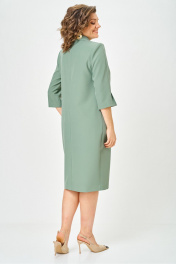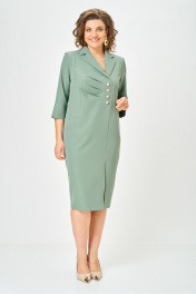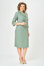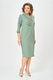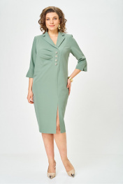 Платье, зауженное к низу, полуприлегающего силуэта, с отрезными бочками фигурной формы и имитацией смещенной застежки на пуговицы со складками, заканчивающейся разрезом. Воротник пиджачного типа. Спинка со средним швом. В боковом шве обработана застежка на потайную тесьму-молнию (изделие имеет ассиметричный крой, имитация застежки не функциональная). Рукав втачной прямой длиной ¾. В среднем шве обработана отлетная шлица.