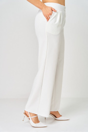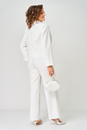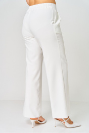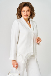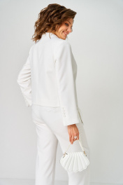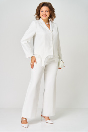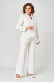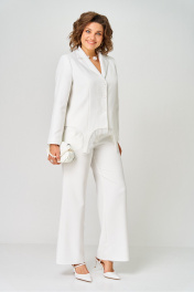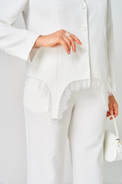 Костюм женский двухпредметный, состоящий из жакета и брюк. Жакет укороченный фантазийной формы по низу и с застежкой на 3 петли-пуговицы до линии перегиба лацкана. Перед с вертикальными рельефными швами, выходящими из плечевого шва и до низа фигурной конфигурации с декоративным полукольцом. Спинка со средним швом. Рукава втачные двухшовные длинные. Воротник пиджачного типа. По низу спинки и фигурному краю переда пришито кружево. Брюки-палацо с притачным поясом сзади на резинке и с застежкой на тесьму-молнию в средних срезах передних половинок брюк и двумя петлями-пуговицами по поясу. В брюках обработаны по 2 складки с каждой стороны и карманы с отрезным бочком.