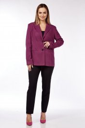 Комплект женский двухпредметный, состоящий из жакета и брюк. Жакет полуприлегающего силуэта длиной до бёдер, с центральной бортовой застёжкой на 2 петли и пуговицы до перегиба лацкана, на подкладке. Детали переда с отрезными бочками, передними вытачками и боковыми прорезными карманами с листочкой с втачными концами. Спинка со средним швом. Рукава втачные, двухшовные, длиные. Воротник пиджачного типа вставлен в лацкан. Брюки слегка зауженные к низу с притачным поясом на резинке по задним половинкам. Застёжка на тесьму - молнию в среднем срезе и на 1 петлю - пуговицу по поясу. В брюках заутюжены стрелки и обработаны наклонные карманы к боковым швам. Длина жакета 66,5 см. Длина рукава - 61 см. Длина брюк по передней части - 99 см.