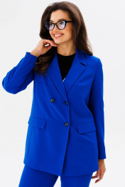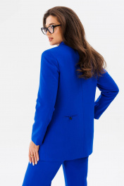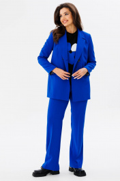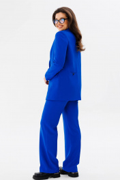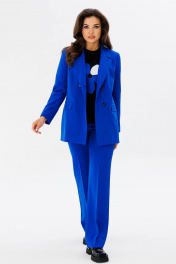 Костюм женский двухпредметный, состоящий из жакета и брюк. Жакет полуприлегающего силуэта со смещённой бортовой застёжкой на две путли-пуговицы и одну потайную петлю-пуговицу до линии перегиба лацкана. На правой детали переда одна отделочная пуговица. Детали переда с отрезными бочками, талиевыми вытачками и карманом в рамку с клапаном. Спинка со средним швом. На левой детали спинки обработан карман в рамку с навесной петлёй и пуговицей. Рукава втачные двухшовные. Воротник пиджачного типа. Брюки с притачным поясом на резинке по задним половинкам и с застёжкой на тесьму-молнию в средних срезах передних половинок. Брюки классического кроя с заутюженными кантами. В брюках обработаны карманы, наклонные к боковому шву. Длина жакета по спинке - 73 см. Длина рукава - 60,5 см. Длина брюк по боковой части - 102 см.