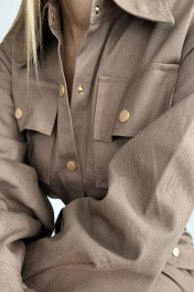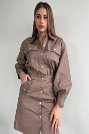 Платье в длине мини. Со спущенной проймой рукава. На рукавах манжет на кнопках. Растежка по всей длине платья на кнопках. С боковыми карманами. Длина изделия по 87-89 см. Длина рукава 53,54 см.