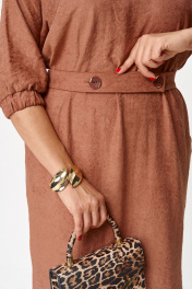 В осенних коллекциях особенно заметна тенденция к практичности и комфортности. Важно использовать одежду, которая не только выглядит шикарно, но и позволяет чувствовать себя уверенно в течение всего дня. При создании данного платья сделали ставку на мягкую ткань с приятной на ощупь бархатистой фактурой, изготовленной на основе лиоцелла, полученного из листьев эвкалипта. Изделие благородного бежево-коричневого цвета излучает непринужденную элегантность. Модель со спущенной линией плеч и круглым вырезом оставили без какого либо декора, но дополнили поясом из этой же ткани (задняя часть пояса с эластичной тесьмой, передняя с застежкой на петли и пуговицы). Платье прямого кроя, длины миди с боковыми разрезами, которые добавляют динамичности силуэту и слегка раскрывают ножки, привлекая внимание к грациозности движений. Рукав 3/4, по низу манжета с эластичной тесьмой. В боковых швах в области бедер для удобства и комфорта обработаны карманы В этом платье вы будете выглядеть неотразимо и со вкусом, отражая истинный дух современной моды!
