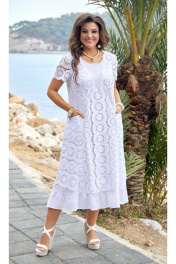Мы в восторге от данной модели, а Вы? Шикарное платье из хлопка - идеально для всех! Украсит любую фигурку и сделает Ваш образ неотразимым! По переду горловина округлой формы оформлена кружевом, красиво выложены фестоны по лифу, и фигурный подрез под грудью. По переду платья вертикальные подрезы с вставками из однотона с застроченными складками и карманами в бочках. Спинка отрезная, с талиевыми вытачками и вертикальными подрезами. По низу платья притачной волан со сборкой из однотона. Рукав в платье втачной, короткий с фестонами по низу. Длина платья от высшей точки плечевого шва до низа 122 см (р.50-54), 124 см (р.56-60). Длина рукава 23 см. платье 50 52 54 56 58 60 обхват груди 108 112 116 120 124 128 обхват талии 110 114 118 122 126 130 обхват бедер 124 128 132 138 142 146 ширина рукава вверху 39 41 43 45 47 49