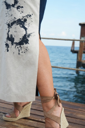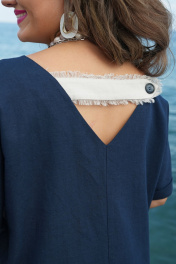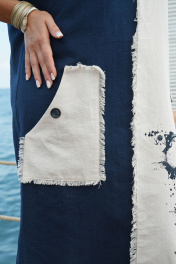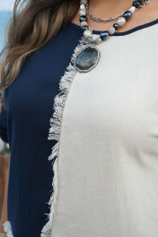 Платье женское идеально для жаркого лета, простой крой, не сковывающий движения. Платье сочетает в себе комбинацию контрастных цветов, а дизайнерская печать по детали переда добавляет яркий акцент. Платье прямого силуэта, длинное с высокими разрезами в боковых швах. Горловина в платье округлой формы, линия плеча, спущенная с притачной манжетой по низу. По переду платья вертикальный подрез со вставкой из бахромы, по правой половинке платья настрочной фигурный карман с декоративной отделкой в виде бахромы и декоративной пуговицы. Спинка с V-образным вырезом по горловине, притачной патой с декоративной отделкой в виде бахромы и декоративной пуговицы. Спинка со средним швом.Длина платья от высшей точки плечевого шва до низа 135 см (р.52-56), 139 см (р.58-62). Длина рукава 20 см. платье 52 54 56 58 60 62 обхват груди 121 125 129 133 137 141 обхват талии 120 124 128 132 136 140 обхват бедер 128 132 136 140 144 148 ширина рукава вверху 43 45 47 49 51 53