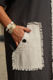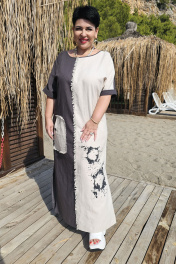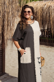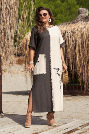 Платье женское идеально для жаркого лета, простой крой, не сковывающий движения. Платье сочетает в себе комбинацию контрастных цветов, а дизайнерская печать по детали переда добавляет яркий акцент. Платье прямого силуэта, длинное с высокими разрезами в боковых швах. Горловина в платье округлой формы, линия плеча, спущенная с притачной манжетой по низу. По переду платья вертикальный подрез со вставкой из бахромы, по правой половинке платья настрочной фигурный карман с декоративной отделкой в виде бахромы и декоративной пуговицы. Спинка с V-образным вырезом по горловине, притачной патой с декоративной отделкой в виде бахромы и декоративной пуговицы. Спинка со средним швом.Длина платья от высшей точки плечевого шва до низа 135 см (р.52-56), 139 см (р.58-62). Длина рукава 20 см. платье 52 54 56 58 60 62 обхват груди 121 125 129 133 137 141 обхват талии 120 124 128 132 136 140 обхват бедер 128 132 136 140 144 148 ширина рукава вверху 43 45 47 49 51 53