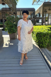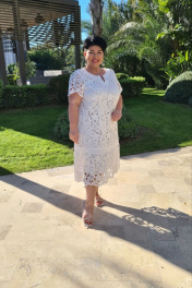 Великолепное платье - просто находка для лета! Легкое, приятное к телу, из 100% натуральных тканей, которые подарят вам легкость и комфорт, даже в жаркие летние дни. Удивительной красоты кружевное шитье с нежным, благородным дизайном создает кокетливый и романтичный образ! Платье идеально для летних торжеств и повседневной носки. В нем вы всегда будете ловить на себе восхищённые взгляды. По переду горловина округлой формы с однотонной вставкой с разрезом, который украшен съёмной декоративной булавкой. По переду платья нагрудная вытачка, выходящая из проймы. По низу переда и спинки подрез со вставкой из однотонной ткани в цвет платья и волан со сборкой. Волан заканчивается нежными фестонами по низу. Рукав втачной, одношовный, по низу волан с фестонами. Платье на хлопковой подкладке. Обращаем ваше внимание, что фурнитура может незначительно отличаться от фото. Длина платья от высшей точки плечевого шва до низа 109 см (р.50-54), 111 см (р.56-60). Длина рукава 23 см. платье 50 52 54 56 58 60 обхват груди 106 110 114 118 122 126 обхват талии обхват бедер 120 124 128 132 136 140 ширина рукава вверху 38 40 42 44 46 48