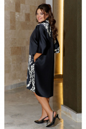 Стильное платье со вставками из отделочной ткани с принтом из ярких вкраплений расположенном в динамичном рисунке. Они создают контраст с основным фоном, делая образ более интересным и привлекательным. Основной фон платья выполнен в глубоком насыщенном чёрном цвете, который придаёт наряду элегантность и загадочность. Такое платье идеально подойдёт для создания вечернего образа, а так же для повседневной носки, оно будет хорошо сочетаться с различными аксессуарами и обувью. Платье О-образного силуэта с застёжкой на петли-пуговицы по цельнокроеной планке, отложным воротником со стойкой. По переду платья фигурные подрезы со вставкой из отделочной ткани. Рукав в платье цельнокроеный. Спинка в платье с фигурным подрезом и вставкой из отделочной ткани. В боковых швах платья карманы. Низ в платье ассиметричный. Длина платья от точки основания шеи до низа 115 см (р.52-56), 117 см (р.58-62). Длина рукава 53,5 см (р.52-56), 55 см (р.58-62). Платье 52 54 56 58 60 62 обхват груди 128 132 136 140 144 148 обхват талии обхват бедер 126 130 134 138 142 146 ширина рукава внизу 40 40 40 42 42 42