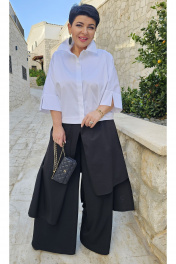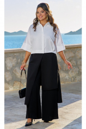 Ещё никогда сочетание белого верха и чёрного низа в модели не выглядело так стильно. Элегантный и в меру дерзкий женский комплект состоит из укороченной блузки белого цвета и чёрных, широких, многослойных брюк. Данный комплект можно стилизовать различными аксессуарами и обувью, позволяя создавать разнообразные образы в зависимости от настроения и ситуации. Блузка свободного силуэта, укороченная с ассиметричной линией низа, с центрально-бортовой потайной застёжкой на петли- пуговицы и воротником рубашечного типа. Низ блузки оформлен декоративными складками переходящими с левой детали на спинку. Спинка в блузке без особенностей. Рукав цельнокроеный с притачной широкой манжетой с декоративным разрезом по низу. Брюки свободного силуэта, широкие, из лёгкой струящейся ткани, имеют отлетные детали из отделочной ткани, ассиметрично расположенные слоями, и закрепленные по поясу. Пояс притачной на резинке сзади для максимально удобной посадки на любой тип фигуры. Застежка на тесьму молнию по боковом шву и петлю-пуговицу в поясе. Длина блузки от высшей точки плечевого шва до низа 56,5 см(р.50-54), 58,5 см (р.56-60). Длина рукава от горловины с плечом и манжетом 51 см (р.50-54), 52 см (р.56-60). Длина брюк по боковому шву от шва притачивания пояса 108 см (р.50-54), 108,5 см (р.56-60). блузка 50 52 54 56 58 60 обхват груди 152 156 160 164 168 172 обхват талии ширина на уровне линии бедер 120 124 128 132 136 140 брюки 50 52 54 56 58 60 ширина по линии талии с резинкой 80 84 88 92 96 100 ширина по линии талии без резинки 90 94 98 102 106 110 ширина на уровне среднего шва 118 122 126 130 134 138