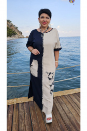 Платье женское идеально для жаркого лета, простой крой, не сковывающий движения. Платье сочетает в себе комбинацию контрастных цветов, а дизайнерская печать по детали переда добавляет яркий акцент. Платье прямого силуэта, длинное с высокими разрезами в боковых швах. Горловина в платье округлой формы, линия плеча, спущенная с притачной манжетой по низу. По переду платья вертикальный подрез со вставкой из бахромы, по правой половинке платья настрочной фигурный карман с декоративной отделкой в виде бахромы и декоративной пуговицы. Спинка с V-образным вырезом по горловине, притачной патой с декоративной отделкой в виде бахромы и декоративной пуговицы. Спинка со средним швом. Длина платья от высшей точки плечевого шва до низа 135 см (р.52-56), 139 см (р.58-62). Длина рукава 20 см. платье 52 54 56 58 60 62 обхват груди 121 125 129 133 137 141 обхват талии 120 124 128 132 136 140 обхват бедер 128 132 136 140 144 148 ширина рукава вверху 43 45 47 49 51 53