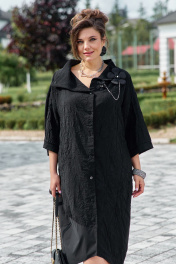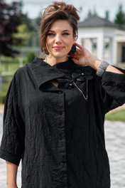 Платье свободного кроя. По переду платья центральная застёжка на петли-пуговицы по борту. Оригинальный высокий воротник, асимметричный, фиксируется при помощи застёжки на потайную кнопку. Линия плеча спущенная. Рукав втачной, длиной 7/8 с притачной манжетой по низу. В боковых швах платья карманы. По правой части переда платья подрез с притачной деталью из однотонной ткани переходящей на спинку платья. Спинка в платье со средним швом. Съемное декоративное украшение в виде стилизованного цветка с цепочками позволяет трансформировать образ. Обращаем Ваше внимание, что фурнитура может незначительно отличаться от фото. Длина платья 105 см, длина рукава 32,5 см (р 52-56), 30,5 см (р 58-62).