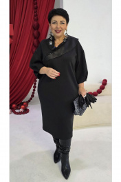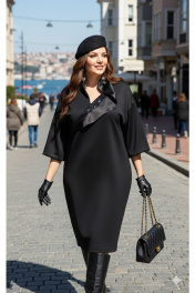Платье, где каждый шов выверен до миллиметра. Глубокий, поглощающий свет чёрный цвет придаёт силуэту графичную чёткость, а фигурный воротник становится главным акцентом. Он изящным изгибом оформляет вырез горловины. Необычная форма воротника как скульптурный элемент, играющий с пропорциями, создаёт динамику подчёркивая хрупкость шеи. Ткань — плотная, но податливая, сохраняя лаконичную элегантность. Платье не нуждается в украшениях — его силуэт говорит сам за себя. Это наряд для тех, кто ценит минимализм. Платье свободного силуэта, с плавным V-образным вырезом горловины, отложным воротником из отделочной ткани переходящим в подрез по переду платья. Линия плеча в платье спущенная. Рукав втачной, длиной ¾, с заложенными декоративными складками по низу. Спинка в платье со средним швом заканчивающимся разрезом от низу. В боковых швах платья - карманы. Длина платья 119 см, длина рукава 52 см. Длина платья 104 см, длина рукава 31 см (р 50-54), 32 см (р 56-60). Размер 50 52 54 56 58 60 обхват груди 116 120 124 128 132 136 обхват бедер 116 120 124 128 132 136 ширина рукава вверху 46 48 50 50 52 54