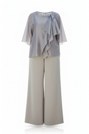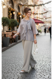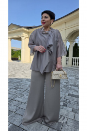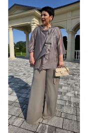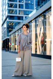 Элегантный брючный костюм, выполненный в мерцающем оттенке, который идеально подходит для создания утонченных образов. Комплект состоит из свободной блузы широких брюк палаццо, обеспечивая непревзойденный комфорт и легкость движений. Блуза привлекает внимание своим асимметричным дизайном с драпировками и широким, ниспадающим воротником, который придает образу динамичность и изысканность. Блуза свободного силуэта, с двойными деталями переда и спинки. Головина округлой формы. Рукав в блузе реглан, длиной ¾, что добавляет силуэту легкости и воздушности. В боковых швах блузы разрезы. Брюки с высокой посадкой и струящимся кроем визуально удлиняют ноги, создавая безупречный и гармоничный ансамбль. Этот костюм идеально подходит как для торжественных мероприятий, так и для деловых встреч, подчеркивая ваш безупречный вкус и чувство стиля. Длина блузы по спинке 68 см. Длина рукава блузы 48 см (р 50-54), 49 см (р 56-60). Длина брюк по боковому шву 108см (р 50-56), 108,5 см (р 58-60). Блуза 50 52 54 56 58 60 обхвт груди 120 124 128 132 136 140 обхват бедер 128 132 136 140 144 148 ширина рукава вверху 48 50 52 53 55 57 Брюки 50 52 54 56 58 60 обхват бедер 120 124 128 132 136 140 обхват талии 76/110 80/114 84/118 88/122 92/126 96/130