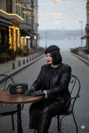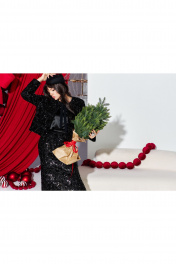 Общий образ — минимализм цвета и максимальная выразительность текстур. Материалы будто говорят на языке контраста: атласный блеск в блузе гармонично сочетается с зеркальной, перламутровой игрой пайетки. Этот комплект создает ощущение современной роскоши для вечерних выходов, деловых мероприятий и торжественных приемов, где ценят изящество без лишних деталей, спокойную уверенность и плавное движение света. Комплект женский, трёх-предметный, состоящий из жакета, блузы и юбки.Жакет (состав: 100% полиэстер, подкладка 100% полиэстер) укороченный, свободного силуэта, без застёжки, с акцентом на ровную линию плеч. Головина округлой формы с прилегающей стойкой из отделочной ткани, переходящей в декоративные ленты, завязывающиеся на бант. Спинка без особенностей. Рукав втачной, длинный. Жакет на подкладке.Блуза (состав: 97% полиэстер, 3 % спандекс) в классическом чёрном оттенке, который гармонично сочетается с насыщенным чёрным цветом комплекта. Блуза прямого силуэта с округлой формой горловины и нагрудными вытачками по полочке. Спинка без особенностей. Низ в блузе фигурной формы.Юбка (состав: 100% полиэстер, подкладка 100% полиэстер) длиной миди держит внимание за счет ткани, украшеной в густую, слегка крупную фактурную пайетку. Юбка прямого силуэта с притачным поясом со вставкой эластичной тесьмы-резинки в бочках. В среднем шве заднего полотнища юбки застёжка на молнию и пуговицу в поясе.Длина жакета по спинке 60 см, длина рукава 60 см. Длина блузы по спинке 65 см, длина плеча 14 см (р 50-54), 14,5 см (р 56-60). Длина юбки 79,5 см. Жакет 50 52 54 56 58 60 ширина на уровне проймы 112 116 120 124 128 132 ширина по низу 116 120 124 128 132 136 Блуза 50 52 54 56 58 60 ширина на уровне проймы 112 116 120 124 128 132 ширина по низу 116 120 124 128 132 136 Юбка 50 52 54 56 58 60 ширина по талии 80/94 84/98 88/102 92/106 96/110 100/114 обхват бедер 118 122 126 130 134 138 ширина пояса 4 4 4 4 4 4