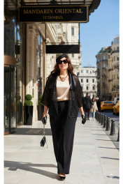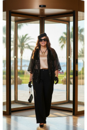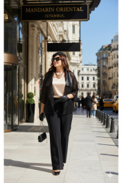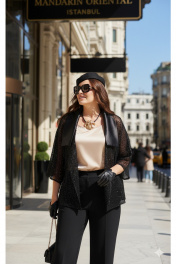 Комплект женский брючный, состоящий из жакета, блузы и брюк. Если Вы ищете идеальное сочетание стиля и комфорта, вот идеальный выбор. Мы специально подобрали качественную и тактильно приятную ткань, которая хорошо держит свою форму, создавая ощущение легкости и свободы движения. Стильный комплект - лучший выбор для тех, кто не боится самовыражаться и приковывать к себе взгляды окружающих. Оригинальный асимметричный крой, помноженный на пластические свойства ткани подчеркнет все, что нужно подчеркнуть, и скроет все, что нужно скрыть.Жакет ( состав: 100% полиэстер) продолжает линию плеча и свободно свисает до середины бедра, образуя мягкую, расслабленную форму. Это не просто вещь, а диалог материалов: матовая глубина сетки и искрящийся блеск пайеток соединяются с атласным воротнико, создавая ансамбль, который легко адаптируется под вечерний выход. Жакет «оверсайз» силуэта с ассиметричной линией борта, отложным воротником из отделочной ткани. Линия плеча в жакете спущенная. Рукав втачной, длиной ¾. Спинка без особенностей. Жакет на подкладке.Блуза (состав: 97% полиэстер, 3 % спандекс) в благородном золотом оттенке, который гармонично сочетается с насыщенным чёрным цветом комплекта. Блуза прямого силуэта с округлой формой горловины и нагрудными вытачками по полочке. Спинка без особенностей. Низ в блузе фигурной формы.Брюки (состав: 97% полиэстер, 3 % спандекс) прямого силуэта, длинные. Пояс в брюках притачной на эластичной тесьме-резинке. По переду брюк прорезные карманы.Длина жакета по спинке 58,5 см (р 50-54), 60,5 см (р 56-60), длина рукава 49 см (р 50-54), 50 (р 56-60). Длина блузы 63,5 см (р 50-54), 64 см (р 56-60), длина рукава (плечо) 8 см (р 50-54), 8,5 см (р 56-60). Длина брюк по боковому шву 108 см. Жакет 50 52 54 56 58 60 ширина на уровне проймы 115 115 115 118 118 118 ширина на уровне бедер 136 136 136 136 148 148 ширина рукава внизу 46 46 46 51 51 51 Блуза 50 52 54 56 58 60 ширина на уровне проймы 106 110 114 118 122 126 обхват талии 105 109 113 117 121 125 обхват бедер 113 117 121 125 129 133 Брюки 50 52 54 56 58 60 ширина по талии 80/98 84/102 88/106 92/110 96/114 100/118 обхват бедер 122 126 130 134 138 142