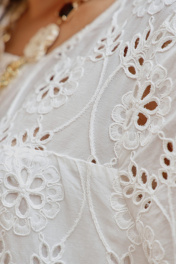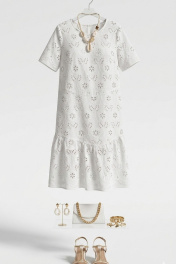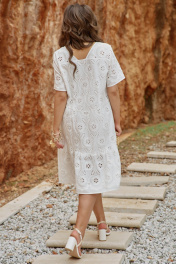 Летнее платье, выполненное из ришелье. Оно мгновенно привлекает внимание. Все детали наряда гармонично сочетаются, создавая уникальный стиль, способный притягивать взгляды. В таком платье любая женщина будет чувствовать себя королевой, готовой покорять мир своим шармом и изяществом, а цвет станет не только символом утонченного вкуса, но и источником вдохновения для всех вокруг. Платье А-силуэта с округлой формой горловины, фигурными подрезами, кокеткой «на просвет» со сборкой от подреза. Спинка в платье с фигурными подрезами, кокетками «на просвет» с декоративными фестонами. Спинка со средним швом и талиевыми вытачками. Рукав в платье втачной, короткий с фестонами по низу. По низу платья притачной волан со сборкой от подреза заканчивающийся фестонами. В качестве дополнительного отделочного элемента в комплекте идёт декоративная брошь. Обращаем Ваше внимание, что фурнитура может незначительно отличаться от фото. Длина платья 106 см. Длина рукава 25 см. Платье 50 52 54 56 58 60 обхват груди 108 112 116 120 124 128 обхват бедер 120 124 128 132 136 140 ширина рукава внизу 38 40 42 42 44 46
