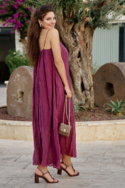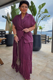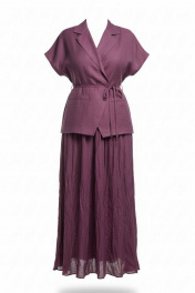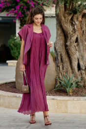 Комплект женский, состоящий из жилета и платья длины «миди». Контраст между гладкостью жилета и фактурностью платья создает визуальную глубину, делает образ интересным для рассмотрения с разных расстояний. Жилет свободного силуэта, на «запах» с фигурной линией борта. Запах — это не просто застежка, он создает динамичную асимметрию — одна сторона накладывается на другую, создавая живую, нестатичную форму. А также игру объемов — в зависимости от того, как завязан жилет, меняется его силуэт. Возможность трансформации — его можно носить плотно запахнутым или свободно, с открытыми полами. Воротник отложной, пиджачного типа. Линия плеча в жилете спущена. По переду жилета декоративные листочки. Спинка со средним швом. В комплекте идёт декоративный пояс из основной ткани. Платье с характерным "мятым" эффектом, который становится главной художественной деталью. Длина миди— золотая середина между скромностью и смелостью, позволяет свободно двигаться. Мятый эффект это не небрежность, а тщательно продуманный художественный прием. Она добавляет тактильности — хочется прикоснуться, ощутить эту "живую" текстуру, смягчает силуэт — делает образ менее формальным, более человечным. Платье длины миди с плавным едва уловимым V-образным вырезом декольте, на регулируемых бретелях. По спинки вставка эластичной тесьмы-резинки, что обеспечивает максимально удобное прилегание. Платье на подкладке.Длина жакета 68 см. Длина платья 134 см. Жакет 50 52 54 56 58 60 обхват груди 120 124 128 132 136 140 обхват бедер 132 136 140 144 148 152 ширина рукава внизу 52 54 56 55 57 59 Платье 50 52 54 56 58 60 обхват груди 112 116 120 124 128 13 обхват бедер 140 144 148 152 156 160