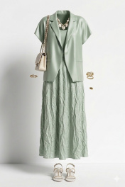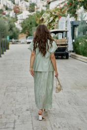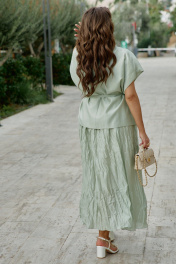 Комплект женский, состоящий из жилета и платья длины «миди». Контраст между гладкостью жилета и фактурностью платья создает визуальную глубину, делает образ интересным для рассмотрения с разных расстояний. Жилет свободного силуэта, на «запах» с фигурной линией борта. Запах — это не просто застежка, он создает динамичную асимметрию — одна сторона накладывается на другую, создавая живую, нестатичную форму. А также игру объемов — в зависимости от того, как завязан жилет, меняется его силуэт. Возможность трансформации — его можно носить плотно запахнутым или свободно, с открытыми полами. Воротник отложной, пиджачного типа. Линия плеча в жилете спущена. По переду жилета декоративные листочки. Спинка со средним швом. В комплекте идёт декоративный пояс из основной ткани. Платье с характерным "мятым" эффектом, который становится главной художественной деталью. Длина миди— золотая середина между скромностью и смелостью, позволяет свободно двигаться. Мятый эффект это не небрежность, а тщательно продуманный художественный прием. Она добавляет тактильности — хочется прикоснуться, ощутить эту "живую" текстуру, смягчает силуэт — делает образ менее формальным, более человечным. Платье длины миди с плавным едва уловимым V-образным вырезом декольте, на регулируемых бретелях. По спинки вставка эластичной тесьмы-резинки, что обеспечивает максимально удобное прилегание. Платье на подкладке.Длина жакета 68 см. Длина платья 134 см. Жакет 50 52 54 56 58 60 обхват груди 120 124 128 132 136 140 обхват бедер 132 136 140 144 148 152 ширина рукава внизу 52 54 56 55 57 59 Платье 50 52 54 56 58 60 обхват груди 112 116 120 124 128 13 обхват бедер 140 144 148 152 156 160