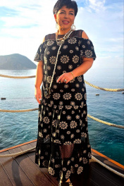 Это платье — воплощение загадочной женственности и изысканной драматичности. Сочетание матового черного крепа и отделочной декоративной сетки создает игру текстур. Платье длины миди балансирует на грани элегантности и соблазна, обещая своей обладательнице внимание и восхищение. Оно для женщины, которая понимает, что настоящая красота часто скрывается в полутонах, что загадка привлекательнее откровенности, а элегантность — вечна. В нем она становится героиней собственного фильма. Платье свободного силуэта, длины «миди». Верхняя часть платья украшена кокеткой, где черная сетка вплетена в основную ткань. Черная сетка — контрастный элемент, вставленный стратегически точно. Она прозрачна, как паутина, но при этом прочна и держит форму. Сетка добавляет платью воздушности, позволяя коже просвечивать сквозь узорчатые ячейки, создавая иллюзию прикрытой наготы. Добавляет платью нотки романтичности так же то, что лиф платья настрачивается декоративными фестонами на кокетку. По переду платья нагрудные вытачки. Рукав втачной одношовный, с оголенным плечом, по верху рукава резинка, что обеспечивает красивую и удобную посадку на любую руку, по низу рукава фестон. Нижняя часть платья оформлена воланами, которые расположены ярусами. Между воланами вставка отделочной ткани— черной сетки. Длина платья 131 см, длина рукава 18 см (р 52-56), 19 см (р 58-62). Платье 52 54 56 58 60 62 обхват груди 111 115 119 123 127 131 обхват талии 118 120 124 128 132 136 обхват бедер 125 129 133 137 141 145 ширина рукава вверху 52 54 56 60 62 64