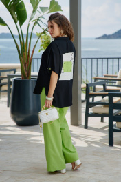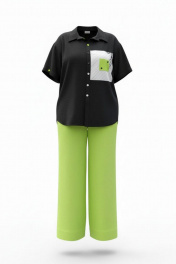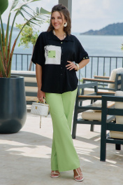 Блузка из чёрного материала становится идеальным фоном для создания базы в гардеробе. Чёрный цвет здесь — не траурный, а драматичный, глубокий, он поглощает свет, чтобы яркие акценты сияли ещё ярче. Эта блузка — не просто предмет гардероба, а инструмент самовыражения. Она достаточно универсальна для офиса, а та же для особых мероприятий. Ключ к успешной стилизации — баланс: позвольте цветочным акцентам быть главными героями образа, а всё остальное пусть будет их достойным фоном. Помните — иногда одна яркая деталь говорит больше, чем целый ансамбль, и эта блузка именно такая деталь. Блузка прямого силуэта с центральной застёжкой на петли-пуговицы по планке, воротником рубашечного типа. По правой детали полочки отрезная кокетка, декоративная вставка из отделочной ткани с ярким акцентом. Линия плеча спущенная, рукав втачной, короткий с декоративным элементом по низу в виде пришивной пуговицы. Спинка в блузке с отрезной кокеткой, декоративной вставкой из отделочного материала с ярким акцентом. Низ в блузке фигурной формы. Длина блузы 80 см (р 52-56), 81 см (р 58-62), длина рукава 21,5 см. Блузка 52 54 56 58 60 62 обхват груди 126 130 134 138 142 146 ширина изделия внизу 130 134 138 142 146 150 ширина рукава внизу 48 48 48 50 50 50